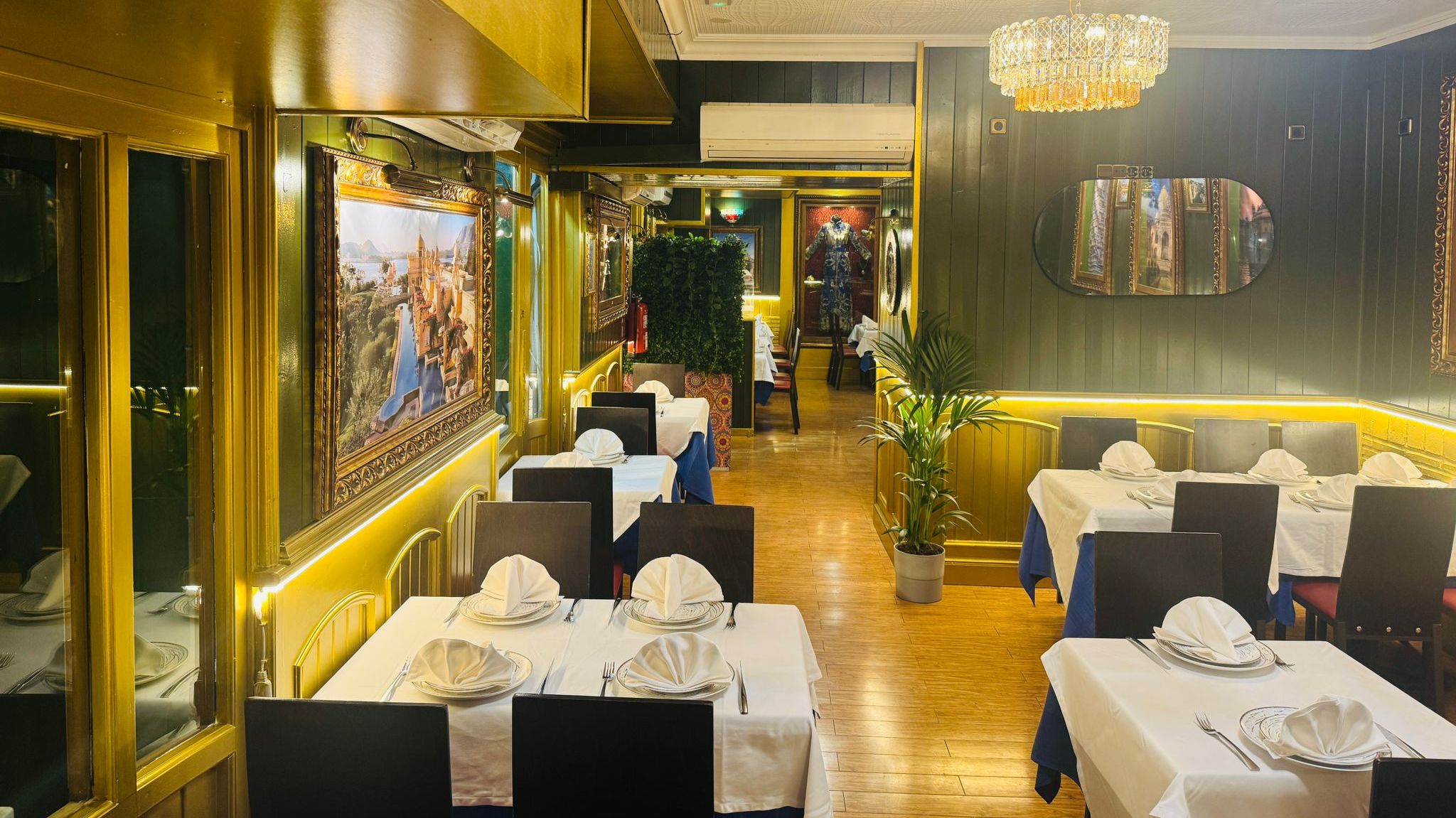 El restaurante ofrece un ambiente elegante y tranquilo, ideal para cenas en pareja, comidas con amigos o celebraciones. La decoración moderna, combinada con detalles de inspiración india, crea una experiencia diferente en Aranjuez.